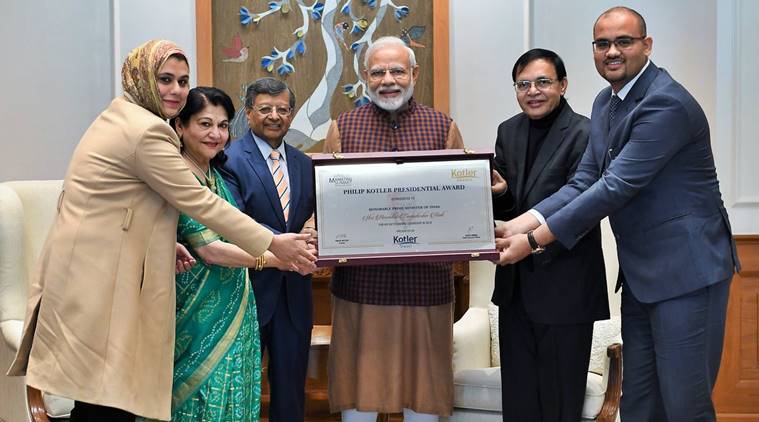 | 9 | PM Narendra Modi receives first-ever Philip Kotler award | Prime Minister Narendra Modi Monday received the first-ever Philip Kotler Presidential award in New Delhi. The award focuses on the triple-bottom-line of ‘people, profit and planet’. It will be offered annually to the leader of a nation, a statement from the Prime Minister’s office said. According to the award citation, Modi was selected for his “outstanding leadership for the nation”. Twitter Ads info and privacy The citation also states that under his leadership, India is now identified as the centre for innovation and value-added manufacturing (Make in India), as well as a global hub for professional services such as information technology, accounting and finance. The statement quoted the citation as saying Modi’s visionary leadership has also resulted in the digital revolution (Digital India), including the Unique Identification Number, Aadhaar, for social benefits and financial inclusion. The citation, the statement said, mentions initiatives such as Make in India, Startup India, Digital India and Swachh Bharat, “which have positioned India as one of the most lucrative manufacturing and business destinations in the world”. |