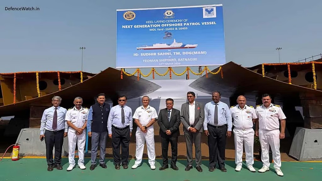 | 3 | Keel Laying Ceremony Marks Milestone for Indian Coast Guard's Next-Gen OPVs | The Indian Coast Guard (ICG) took a decisive step toward bolstering maritime security with the keel laying ceremony for Yard 16402 and 16403, the second and third ships of six Next Generation Offshore Patrol Vessels (OPVs), held at YMPL, Ratnagiri on March 17, 2026. These advanced vessels boast a range of 5,000 nautical miles and a maximum speed of 23 knots. Measuring 117 meters in length with a crew strength of 11 officers and 110 men, they incorporate state-of-the-art machinery and cutting-edge systems, including AI-based predictive maintenance systems, Remote Piloted Drones, Integrated Bridge System (IBS), and Integrated Platform Management System (IPMS). |