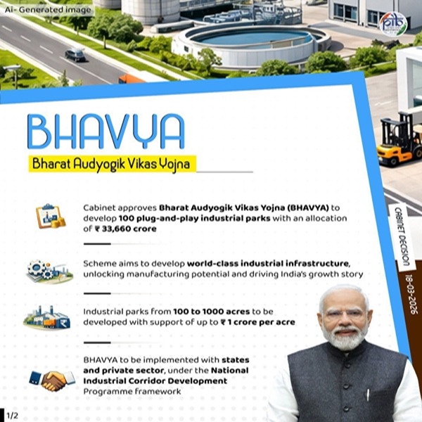 | 2 | Cabinet approves New Era of Industrial Development through Bharat Audyogik Vikas Yojna | The Union Cabinet approved Bharat Audyogik Vikas Yojna (BHAVYA) to develop 100 plug-and-play industrial parks with an allocation of 33 thousand 660 crore rupees. Briefing media in New Delhi after the cabinet meeting, Information and Broadcasting Minister Ashwini Vaishnaw said that the Scheme aims to develop world-class industrial infrastructure, unlocking manufacturing potential and driving the country’s growth story. He said that Industrial parks of 100 to 1000 acres will be developed with support of up to one crore rupees per acre. |