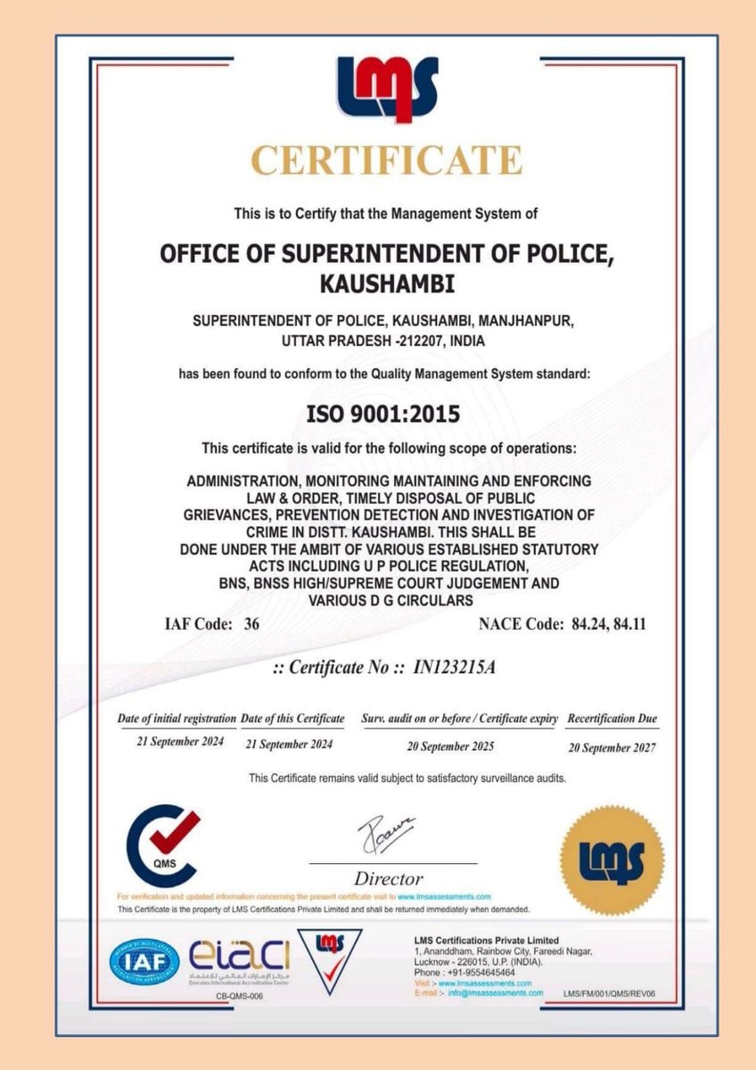| 5 | Kaushambi SP office gets ISO 9001:2015 certificate | The offices of the Superintendent of Police and the Circle Officer of Sirathu were awarded the ISO 9001:2015 Quality Management Certificate for meeting international standards and excellent performance, a senior officer said Sunday. In a post on X in Hindi, the Kaushambi Police on Sunday said, "The Superintendent of Police office and the Circle Officer, Sirathu, office were awarded the ISO 9001:2015 Quality Management Certificate for meeting international standards and excellent performance." Kaushambi Superintendent of Police Brijesh Kumar Srivastava said the SP office has been recognised for meeting international standards for administration, surveillance, maintaining law and order, timely redressal of public grievances and prevention and investigation of crime. |