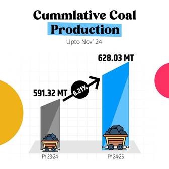 | 1 | Overall Coal Production in November 2024 Reaches 90.62 Million Tonnes | The Ministry of Coal has achieved a remarkable milestone in November 2024, with overall coal production reaching 90.62 million tonnes (MT) (Provisional), compared to 84.52 MT in the same month last year, marking a 7.20% growth. Coal production from captive and other entities has shown significant progress, reaching 17.13 MT (provisional) in November 2024, up from 12.44 MT in November 2023, marking an impressive growth of 37.69% (provisional). Cumulatively, coal production for FY 2024-25 up to November 2024 reached 628.03 MT (Provisional), compared to 591.32 MT during the same period in FY 2023-24, reflecting a growth of 6.21%. (Provisional) |