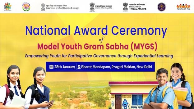 | 8 | National Awards for Model Youth Gram Sabha to Be Conferred in New Delhi | The Ministry of Panchayati Raj in collaboration with the Ministry of Education (Department of School Education and Literacy) and the Ministry of Tribal Affairs, is jointly organizing a National Award Ceremony to felicitate the winners of the Model Youth Gram Sabha (MYGS) on 28th January 2026 in New Delhi. Union Minister of State for Panchayati Raj, Prof. S.P. Singh Baghel and Union Minister of State for Education, Dr. Sukanta Majumdar will grace the occasion. During the event, a comprehensive compendium documenting the transformative journey of the Model Youth Gram Sabha initiative will also be released. Senior officials from the Ministry of Panchayati Raj, Department of School Education and Literacy, Navodaya Vidyalaya Samiti and Eklavya Model Residential Schools will attend the ceremony. The ceremony will celebrate the achievements of over 28,000 students from 619 Jawahar Navodaya Vidyalayas and 200 Eklavya Model Residential Schools who participated in simulated Gram Sabhas and Gram Panchayat proceedings across the country. Around 900 participants, including students and teachers from the winning schools, elected representatives of PRIs and key stakeholders associated with the MYGS initiative will also participate in the event. The inaugural session scheduled from 11:00 AM to 1:00 PM will feature live mock Gram Sabha demonstrations by Jawahar Navodaya Vidyalaya, Una (Himachal Pradesh) and Eklavya Model Residential School, Kosambuda (Chhattisgarh), highlighting experiential learning of democratic processes. While the award ceremony commencing at 2:30 PM will honour winning schools and students for their exemplary understanding of the three-tier Panchayati Raj system envisaged under the 73rd Constitutional Amendment. |
