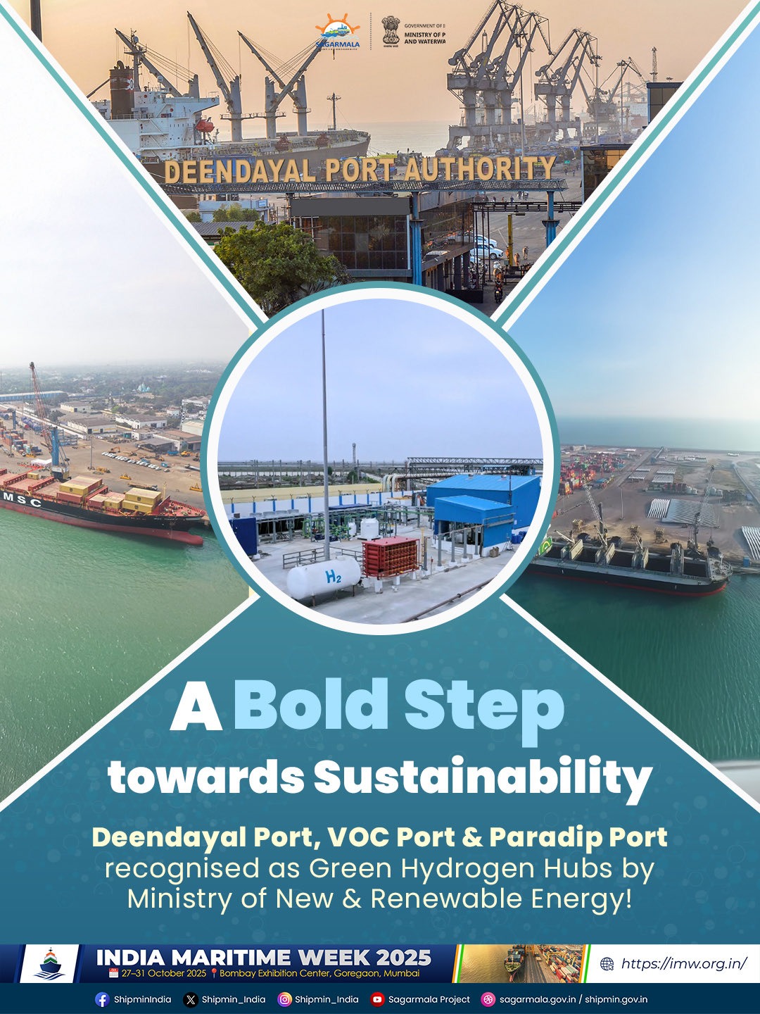 | 5 | Three Major Indian Ports Recognised as Green Hydrogen Hubs Under National Mission | Ministry of New and Renewable Energy has formally recognised three major ports as Green Hydrogen Hubs under the National Green Hydrogen Mission. These ports are Deendayal Port Authority in Gujarat, V.O. Chidambaranar Port Authority in Tamil Nadu and Paradip Port Authority in Odisha. The Ministry said in a statement that this recognition marks a significant step towards creating an integrated hydrogen ecosystem and advancing India’s transition towards clean energy. Welcoming the development, Ports, Shipping and Waterways Minister Sarbananda Sonowal said, this recognition marks a defining moment in India’s maritime journey. He added that government is working towards building an ecosystem of sustainable development that will power India towards realising the vision of becoming net zero by 2070. The National Green Hydrogen Mission aims to position India as a global hub for the production, utilisation, and export of green hydrogen and its derivatives. The Mission promotes the development of large-scale hydrogen hubs to serve as focal points for production and consumption. |