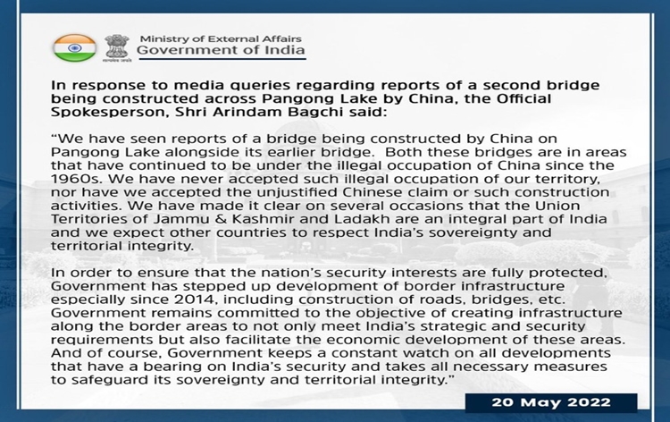 | 7 | India reacts sharply on second bridge being constructed across Pangong Lake by China | Reacting sharply on the second bridge being constructed across Pangong Lake by China, the Ministry of External Affairs has said that both these bridges are in areas that have continued to be under the illegal occupation of China since 1960s. |