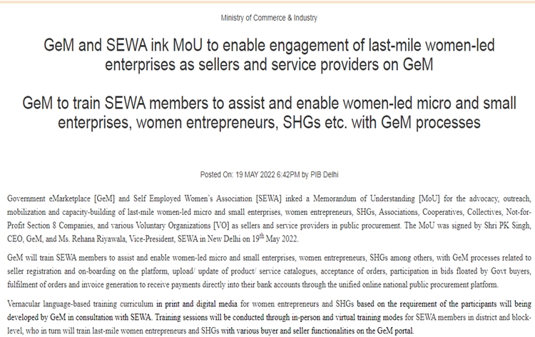 | 6 | GeM inks MoU with Self Employed Women's Association | Government eMarketplace, GeM and Self-Employed Women’s Association, SEWA today inked a Memorandum of Understanding for the advocacy, outreach, mobilization and capacity-building of last-mile women-led micro and small enterprises, women entrepreneurs, SHGs, Associations, Cooperatives, Collectives, Not-for-Profit Section-8 Companies and various voluntary organizations as sellers and service providers in public procurement. |