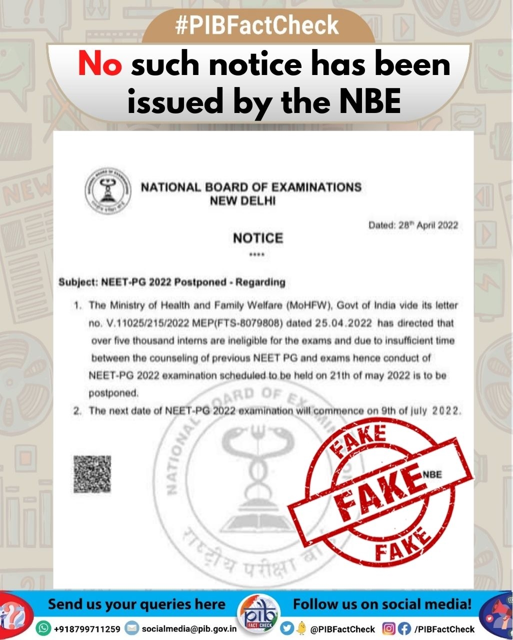 | 6 | Government says NEET PG 2022 has not been postponed, to be held as scheduled on May 21 | The government has said that the National Eligibility cum Entrance Test for Postgraduate (NEET PG 2022) has not been postponed and will be held as scheduled on 21st of May. Press Information Bureau (PIB) has termed the notice issued in the name of the National Board of Examinations claiming that the NEET PG exam has been postponed as fake. It said, no such notice has been issued by the Board. |