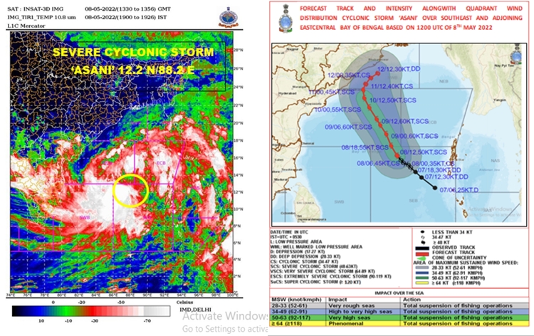 | 4 | Severe Cyclonic Storm ‘Asani’: Heavy rain likely to lash Andhra Pradesh, Odisha and West Bengal from tomorrow | The Severe Cyclonic Storm ‘Asani’ over West-central and adjoining South Bay of Bengal moved nearly northwestwards with a speed of 16 kilomtres per hour during past six hours and lay centered at 1430 hours IST of today, over Westcentral Bay of Bengal, about 860 kms west-northwest of Port Blair (Andaman Islands), 410 kms southeast of Visakhapatnam, Andhra Pradesh and 590 kms south of Puri, Odisha. |