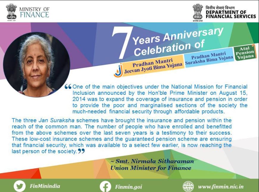 | 2 | PMJJBY, PMSBY, and APY complete seven years of providing social security net | Pradhan Mantri Suraksha Bima Yojana (PMJJBY), Pradhan Mantri Jeevan Jyoti Bima Yojana (PMSBY), and Atal Pension Yojana (APY) on Monday complete seven years of providing social security net. The schemes were launched by Prime Minister Narendra Modi on 9th May 2015 in Kolkata, West Bengal. These schemes have been successful in providing affordable insurance and security to people. These three social security schemes are dedicated to the welfare of the citizens, recognizing the need for securing human life from unforeseen risks or losses and financial uncertainties. In order to ensure that the people from the unorganized section of the country are financially secure, the Government launched two insurance schemes - Pradhan Mantri Jeevan Jyoti Bima Yojana and Pradhan Mantri Suraksha Bima Yojana and introduced Atal Pension Yojana to cover the exigencies in the old age. |