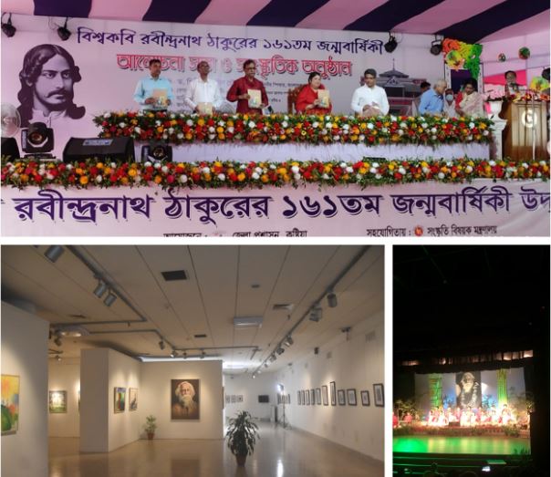 | 1 | Bangladesh: Tagore birth anniversary celebrated across the country | The 161st birth anniversary of Gurudev Rabindranath Tagore was celebrated across Bangladesh on Sunday with programmes, events, discussions, art exhibitions being organised at several places. The birth anniversary of Rabindranath Tagore is celebrated in Bangladesh according to the Bangla Calendar. Tagore was born on 25th of Baishakh in Bangla year 1268 in Kolkata. Parliament Speaker Dr Shirin Sharmin Chaudhury inaugurated the main programme at Shilaidaha Rabindra Kuthibari in Kumarkhali Upazila of Kushtia district. The theme of this year’s programme was 'Crisis of Humanity and Rabindranath'. State Minister for Cultural Affairs K M Khalid chaired the programme. Renowned Rabindra Sangeet exponent Rezwana Choudhury Bannya presented songs at the event, reports the official news agency BSS. |