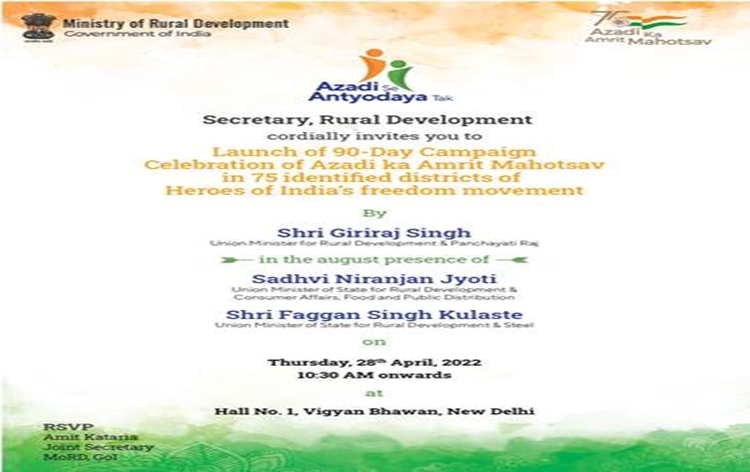 | 1 | Union Minister Giriraj Singh launches 90-day inter-ministerial campaign Azadi se Antyodaya Tak | Rural Development Minister Giriraj Singh today launched ‘Azadi se Antyodaya Tak,’ 90-day inter-ministerial campaign under Azadi Ka Amrit Mahotsav. Celebrating the spirit of the year-long Azadi Ka Amrit Mahotsav, the identified districts are aligned with the birthplace of one hundred Freedom Fighters, who made the ultimate sacrifice for the nation during its struggle for independence. The campaign will be implemented involving all rural stakeholders like families of selected freedom fighters, Panchayati Raj Institutions, women networks, youth groups and students highlighting the achievements of the schemes. |