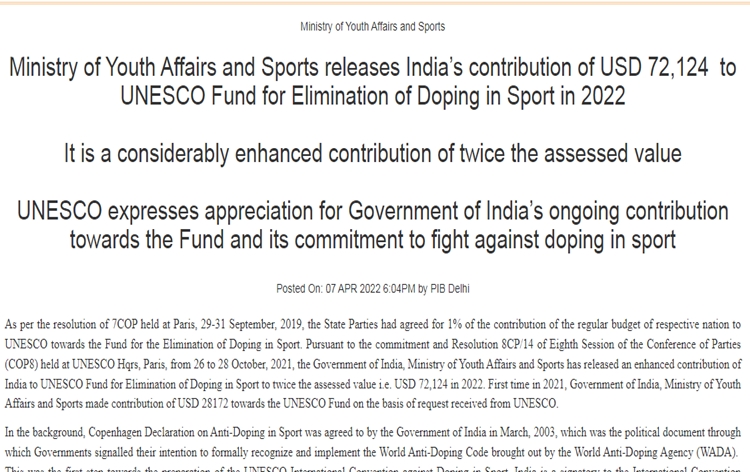 | 4 | Youth Affairs, Sports Ministry releases India’s contribution of 72,124 Dollars to UNESCO Fund for Elimination of Doping in Sport in 2022 | Ministry of Youth Affairs and Sports has released India’s contribution of 72,124 Dollars to UNESCO Fund for Elimination of Doping in Sport in 2022. It is a considerably enhanced contribution of twice the assessed value. As per the resolution of 7COP held at Paris in September 2019, the State Parties had agreed for one percent of the contribution of the regular budget of respective nation to UNESCO towards the Fund for the Elimination of Doping in Sport. |