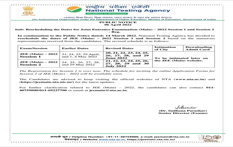 | 4 | JEE Mains 2022 schedule revised by NTA for both sessions | The National Testing Agency, NTA released a revised schedule yesterday for the conduct of Joint Entrance Exam JEE Mains 2022. The schedule has been revised for both sessions 1 and 2. The JEE Main Session 1 will now be held on 20, 21, 22, 23, 24, 25, 26, 27, 28, and 29th of June 2022. The JEE Main Session 2 will now be held on 21, 22, 23, 24, 25, 26, 27, 28, 29, and 30th of July 2022. NTA said, the registration for Session 1 is over and the schedule for inviting the online application forms for Session 2 will be available soon. The candidates have been advised to keep visiting websites |
