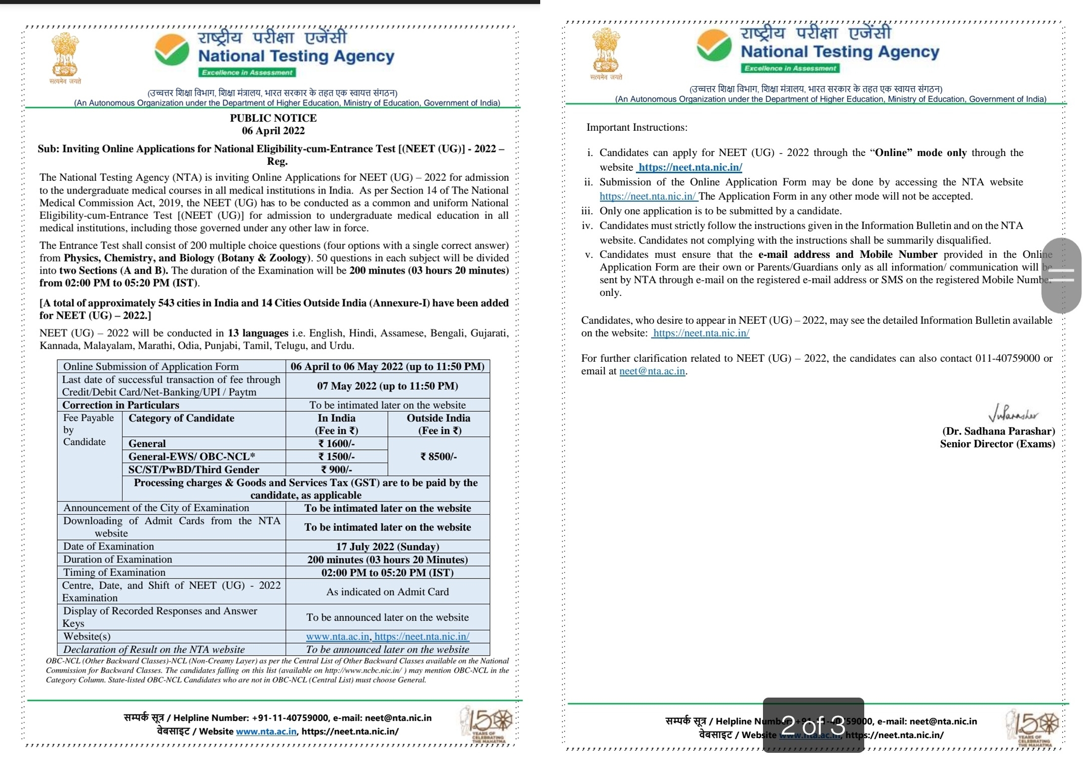 | 3 | NEET UG 2022 application registration begins, exam to be conducted on 17th July | The NEET-UG 2022 for admission to undergraduate medical education in all medical institutions will be conducted on 17th July. The National Testing Agency NTA has started the NEET 2022 registration on the website This year, there will be no upper age limit for appearing in NEET. Earlier, it used to be 25 years with a relaxation of 5 years for reserved category candidates. |