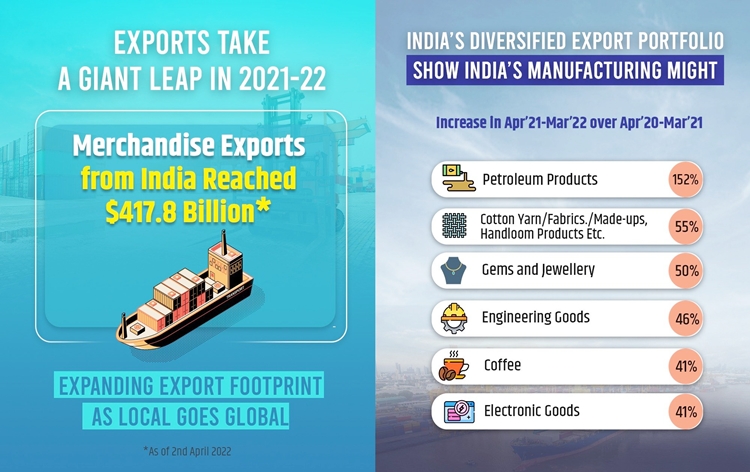| 4 | India's exports hit a record high of 418 billion dollars in 2021-2022 | The Commerce and Industry Minister, Piyush Goyal, has said that the country’s goods exports have now crossed the 418 billion US dollar mark. Addressing the media in New Delhi on India's historic export figures for the financial year 2021-22, Mr Goyal said, that it is an important milestone in the journey towards an Aatmanirbhar Bharat. |