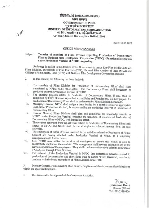 | 9 | I&B Ministry directs merger of film media units under NFDC | Information and Broadcasting Ministry has transferred the mandate of production of documentaries and short films, organization of film festivals and preservation of films to the National Film Development Corporation, NFDC, a Public sector undertaking working under the Ministry. |