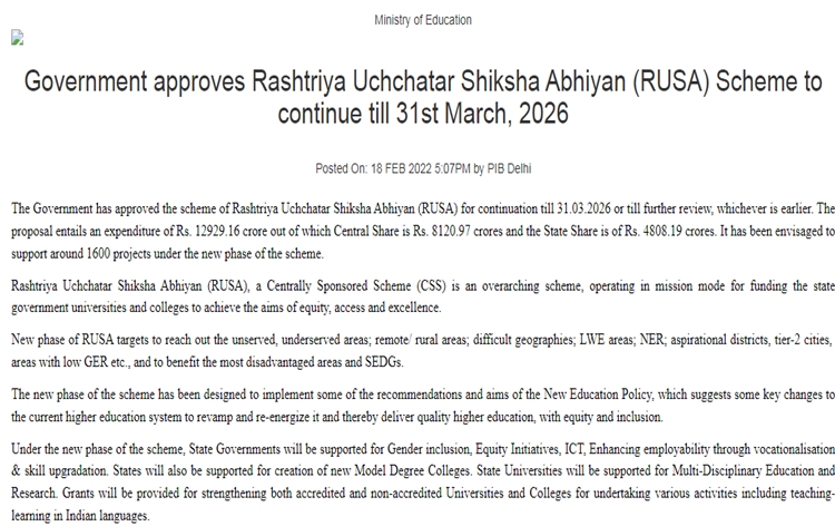 | 6 | Government approves Rashtriya Uchchatar Shiksha Abhiyan scheme to continue till 31st March 2026 | The Government has approved the scheme of Rashtriya Uchchatar Shiksha Abhiyan (RUSA) for continuation till 31st March 2026. The proposal entails an expenditure of over 12 thousand 929 crore rupees. Education Ministry said, it has been envisaged to support around one thousand 600 projects under the new phase of the scheme. |