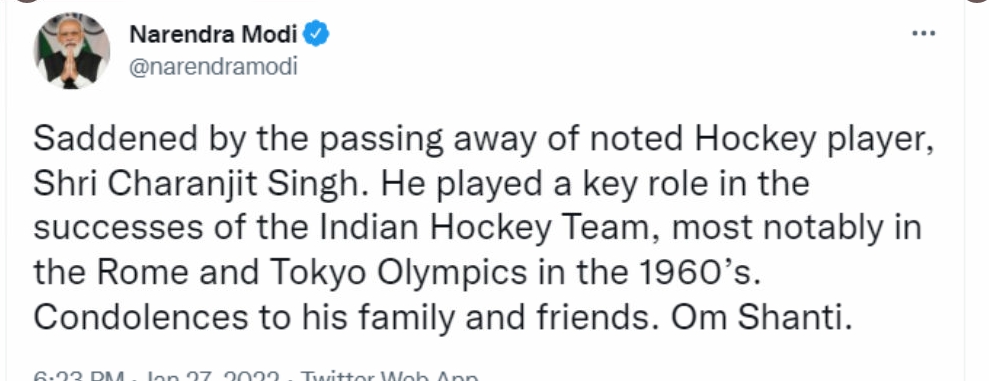 | 3 | PM expresses sadness at passing away of hockey player Charanjit Singh | Prime Minister Narendra Modi has expressed sadness at the passing away of noted hockey player Charanjit Singh. In a tweet, Mr Modi said he played a key role in the successes of the Indian hockey team, most notably in the Rome and Tokyo Olympics in the 1960’s. He extended his condolences to his family and friends. |