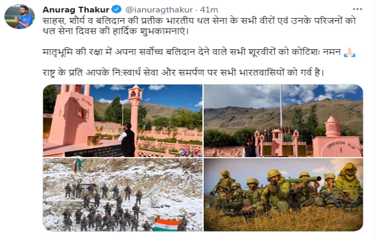 | 3 | Indian Army is a symbol of courage, valor and sacrifice: Anurag Thakur | Information and Broadcasting Minister Anurag Thakur has greeted the Indian Army on the occasion of Army Day. In a tweet today, Mr. Thakur said, Happy Army Day to all the heroes of the Indian Army and their families. He said, Indian Army is a symbol of courage, valor and sacrifice. He saluted to all the brave soldiers who made supreme sacrifice while protecting their motherland. He said, all Indians are proud of selfless service and dedication of soldiers towards the nation. |