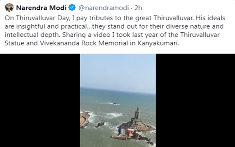 | 2 | PM Modi pays tribute to great poet, philosopher Thiruvalluvar on Thiruvalluvar Day | Prime Minister Narendra Modi has paid tributes to the great poet and philosopher Thiruvalluvar on Thiruvalluvar Day. In a tweet, Mr Modi said, his ideals are insightful and practical and they stand out for their diverse nature and intellectual depth. Prime Minister also shared a video that he took last year of the Thiruvalluvar Statue and Vivekananda Rock Memorial in Kanyakumari. |