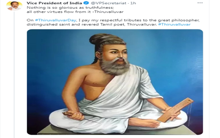 | 6 | Vice Prez M Venkaiah Naidu pays tribute to great philosopher, revered Tamil poet Thiruvalluvar | Vice President M Venkaiah Naidu today paid his tributes to the great philosopher, distinguished saint and revered Tamil poet, Thiruvalluvar on Thiruvalluvar Day. In a tweet, Mr Naidu called upon everyone to read Thiruvalluvar iconic and timeless scripture, Thirukkural which is a guide to living a virtuous life. |