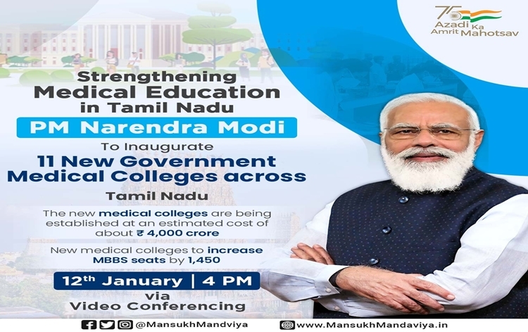 | 1 | PM Modi to inaugurate 11 new Govt Medical Colleges across Tamil Nadu and new campus of Central Institute of Classical Tamil in Chennai | Prime Minister Narendra Modi will inaugurate 11 New Government Medical Colleges across Tamil Nadu and the new campus of Central Institute of Classical Tamil in Chennai today. The new medical colleges are being established at an estimated cost of about 4 thousand crore rupees. Of this amount, around 2 thousand 145 crore rupees have been provided by the Union government and rest by the Tamil Nadu government. The districts in which the new Medical Colleges are being established are Virudhunagar, Namakkal, The Nilgiris, Tiruppur, Thiruvallur, Nagapattinam, Dindigul, Kallakurichi, Ariyalur, Ramanathapuram, and Krishnagiri. The establishment of these medical colleges is in line with the Prime Minister's constant endeavour to promote affordable medical education and improve health infrastructure in all parts of the country. The new medical colleges, with cumulative capacity of 1 thousand 450 seats, are being established under the Centrally Sponsored scheme of ’Establishing of New Medical Colleges attached with existing district and referral hospital’. |