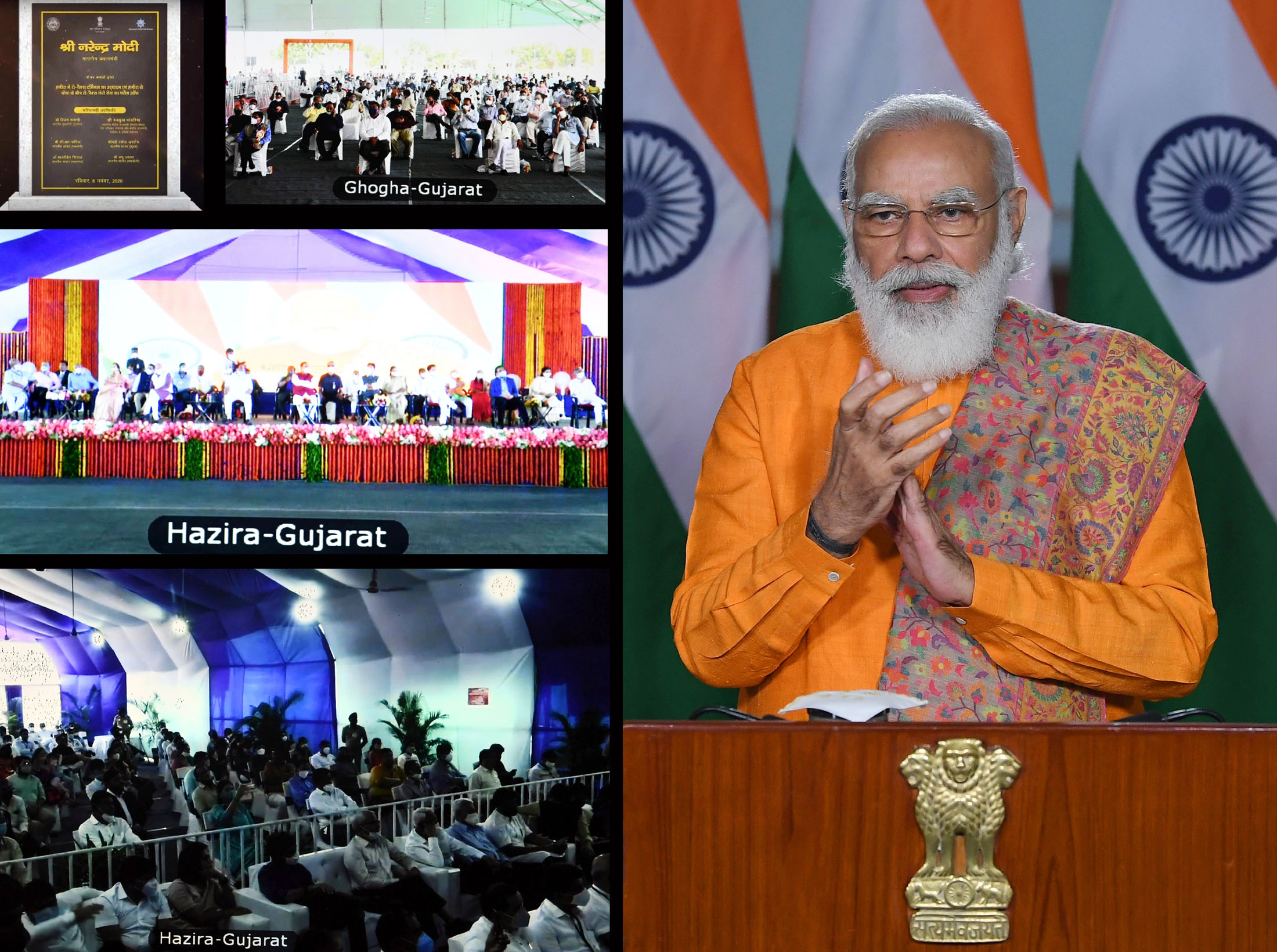 | 4 | PM inaugurates Ro-Pax terminal at Hazira; Flags off Ro-Pax ferry service between Hazira & Ghogha in Gujarat | Prime Minister Narendra Modi inaugurated the Ro-Pax terminal at Hazira and flagged off the Ro-Pax ferry service between Hazira and Ghogha in Gujarat through video conferencing. He also interacted with the local users. He renamed the Ministry of Shipping as the Ministry of Ports, Shipping and Waterways. Speaking on the occasion, the Prime Minister said today, people of Gujarat have got their Diwali gift. Everyone will benefit from this better connectivity. He added that business will be boosted and connectivity will become faster. He further said RO-PAX service between Hazira and Ghogha has made dreams come true for the people of Saurashtra and South Gujarat, as the journey is shortened from 10-12 hours to 3-4 hours. He said this will save time and expenses will also be reduced. He said about 80000 passenger trains and 30000 trucks will be able to take advantage of this new service in a year. |