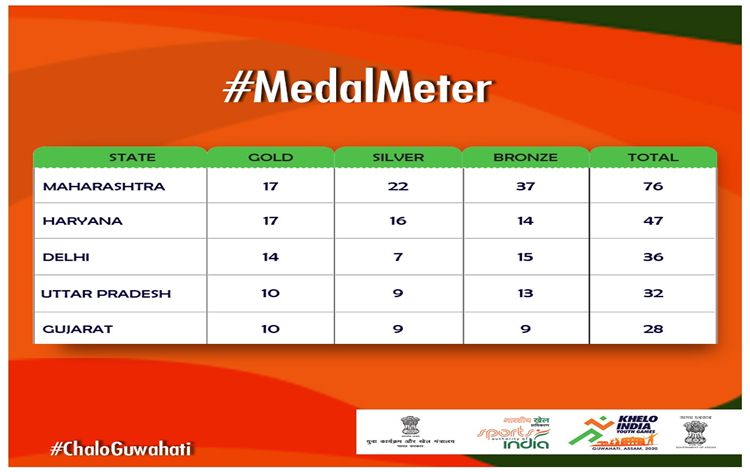 | 4 | Maharashtra and Haryana neck and neck in medal tally of Khelo India Youth Games at Guwahati | Maharastra and Harayana are neck to neck in the medal tally of Khelo India Youth Games at Guwahati. The defending champions, Maharashtra yesterday picked up five gold to manage a tally of total 76 medal with 17 gold and maninten top spot. Haryana also won 17 gold with total 47 medal. Delhi and Gujarat occupied the third and fourth spots. |