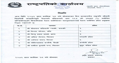 | 8 | Nepal's President appoints new governors in all seven provinces | Nepal's President Bidya Devi Bhandari has appointed new governors in all seven provinces of the country. According to a press release issued by the Office of President, new governors have been appointed on the recommendation of cabinet. Somnath Adhikari ‘Pyasi’ will be the new governor of Province 1, Tilak Pariyar for Province 2, Bishnu Prasad Prasai for Province 3, Amik Sherchan for Gandaki Province, Dharmanath Yadav for Province 5, Govinda Kalauni for Karnali Province and Sharmila Kumari Panta for Sudur Paschim Province. They are likely to be administered oath of office and secrecy today. |